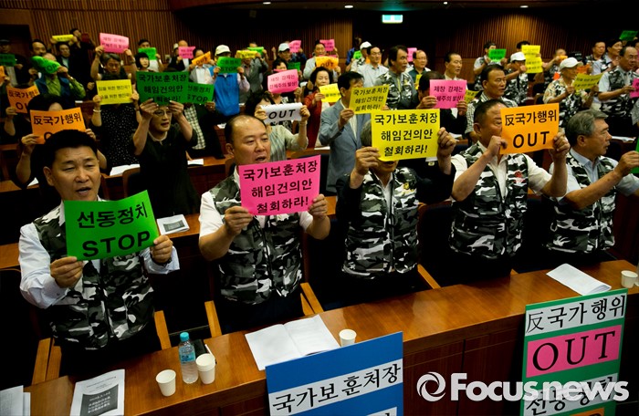 (서울=포커스뉴스) 28일 오전 서울 여의도 국회 헌정기념관에서 열린 '임을 위한 행진곡' 기념곡 지정저지 범국민대책본부 출범식 및 결의대회에 참석한 관련단체 회원 및 참석자들이 피켓을 들고 구호를 외치고 있다.