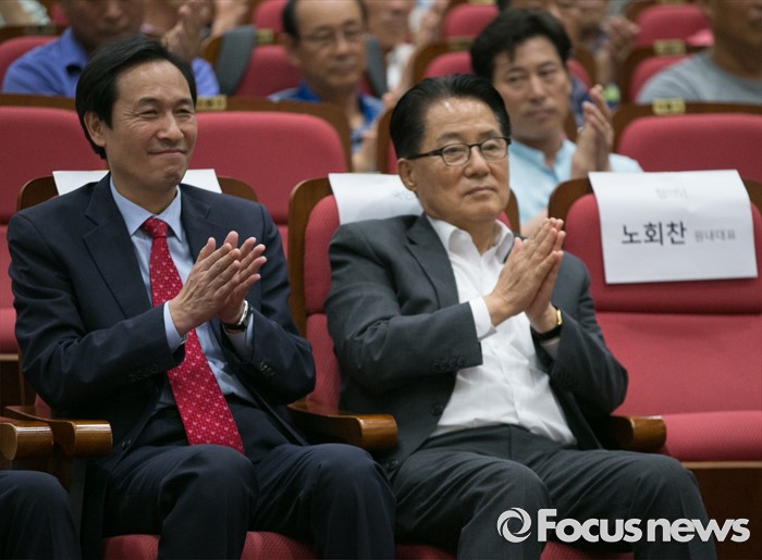 (서울=포커스뉴스) 28일 오후 서울 여의도 국회 의원회관에서 열린 20대 국회가 꼭 해야 할 농업개혁 과제 정책토론회에 참석한 우상호(왼쪽) 더불어민주당 원내대표와 박지원 국민의당 원내대표가 박수치고 있다.