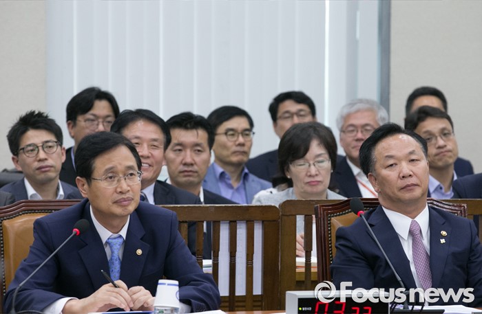 (서울=포커스뉴스) 28일 오후 서울 여의도 국회에서 열린 안전행정위원회 전체회의에 참석한 김용희(왼쪽) 중앙선거관리위원회 사무총장과 김동극 인사혁신처장이 의원들의 질의를 듣고 있다.