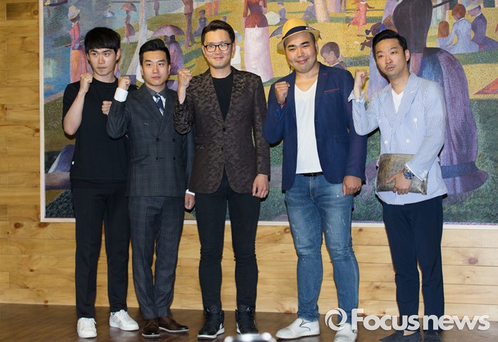 (서울=포커스뉴스) 28일 오후 서울 마포구 신한류플러스에서 여린 제1회 홍대 코미디위크 기자간담회에 참석한 개그맨 윤형빈(가운데) 소극장팀이 포즈를 취하고 있다.