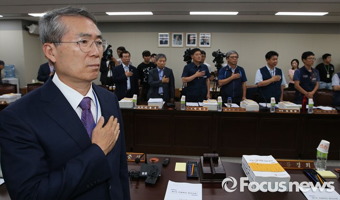 (세종=포커스뉴스) 박준성 최저임금위원회 위원장이 28일 오후 세종시 정부세종청사 고용노동부 최저임금위원회 전원히의실에서 열린 최저임금위원회 제7차 전원회의에서 국기에 대한 경례를 하고 있다.