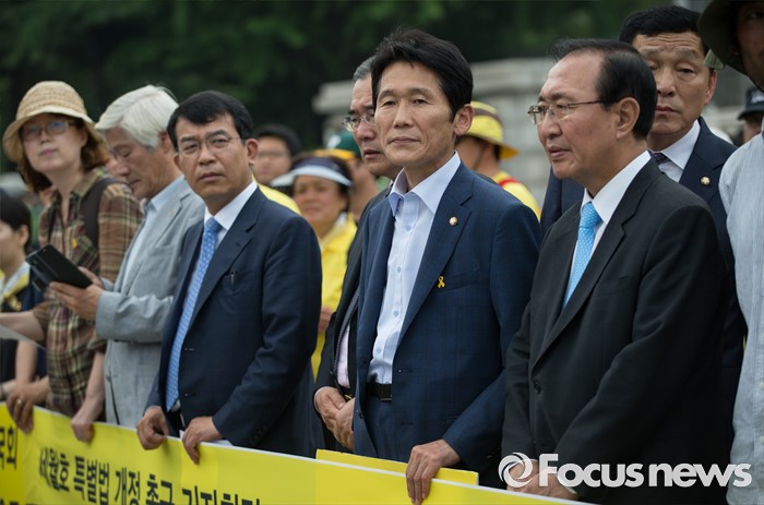 (서울=포커스뉴스) 노회찬 정의당 원내대표와 윤소하 정의당 의원이 28일 오후 서울 여의도 국회 앞에서 세월호 유가족과 함께 20대 국회, 6월 임시국회에 특별법 개정을 촉구하는 기자회견을 갖고 있다.