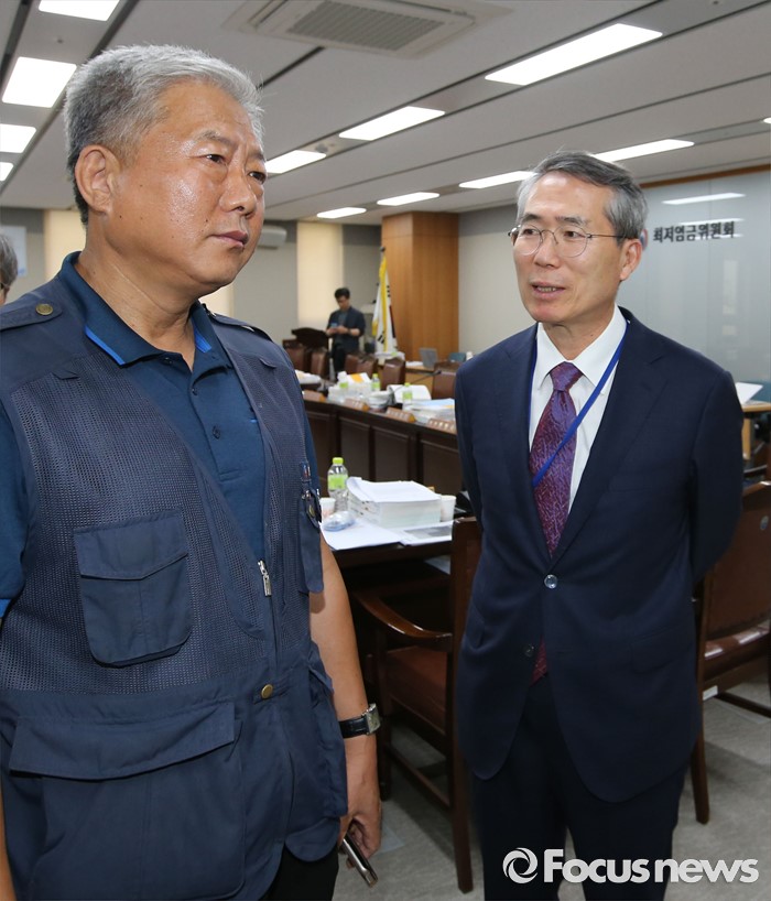 (세종=포커스뉴스) 28일 오후 세종시 정부세종청사 고용노동부 최저임금위원회 전원회의실에서 열린 제7차 전원회의가 정회돼, 김동만(왼쪽) 한국노총 위원장이 전원회의실을 방문, 박준성 최저임금위원회 위원장과 대화를 하고 있다.