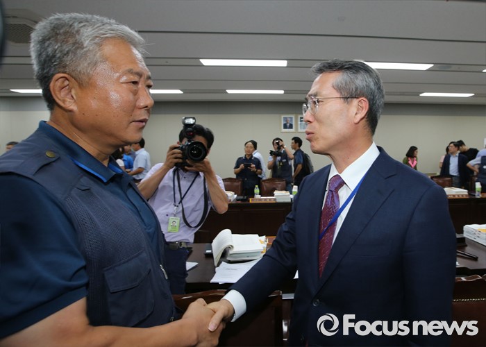 (세종=포커스뉴스) 28일 오후 세종시 정부세종청사 고용노동부 최저임금위원회 전원회의실에서 열린 제7차 전원회의가 정회돼, 김동만(왼쪽) 한국노총 위원장이 전원회의실을 방문, 박준성 최저임금위원회 위원장과 악수하고 있다.