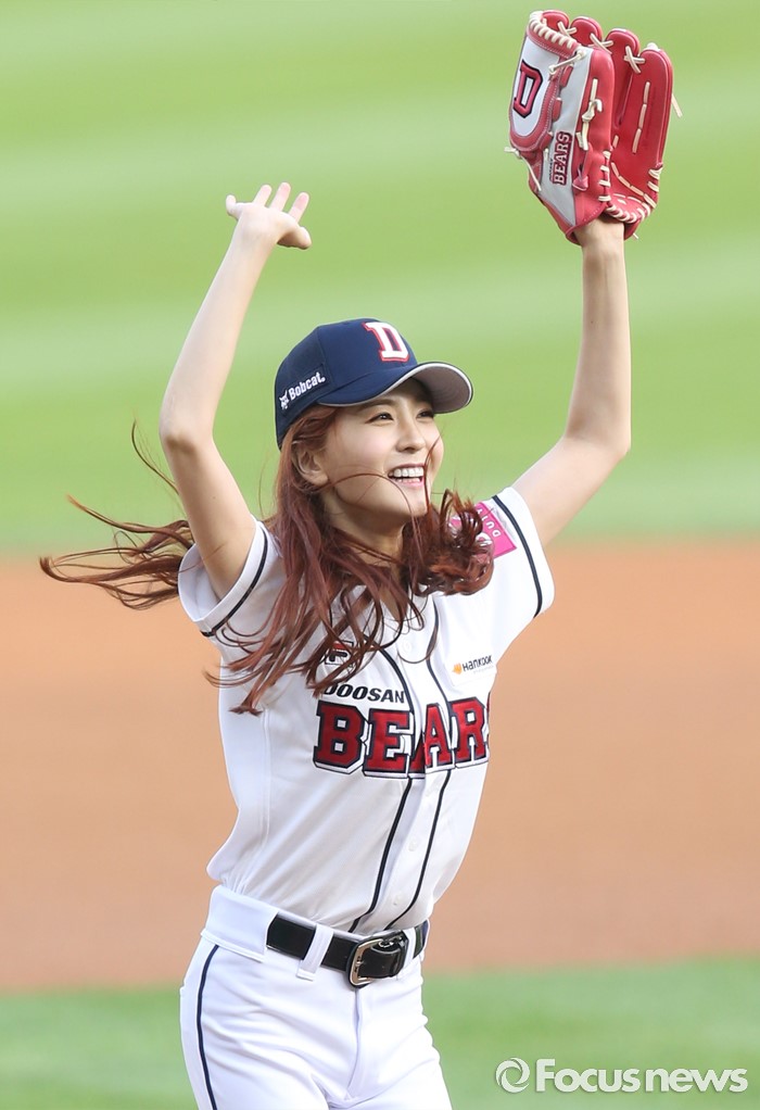 (서울=포커스뉴스) 28일 서울 잠실구장에서 열린 2016 프로야구 NC-두산 경기에서 시구자 걸그룹 소나무의 나현이 투수 마운드를 밟고 시구를 하고 팔짝 팔짝 뛰며 기뻐하고 있다.