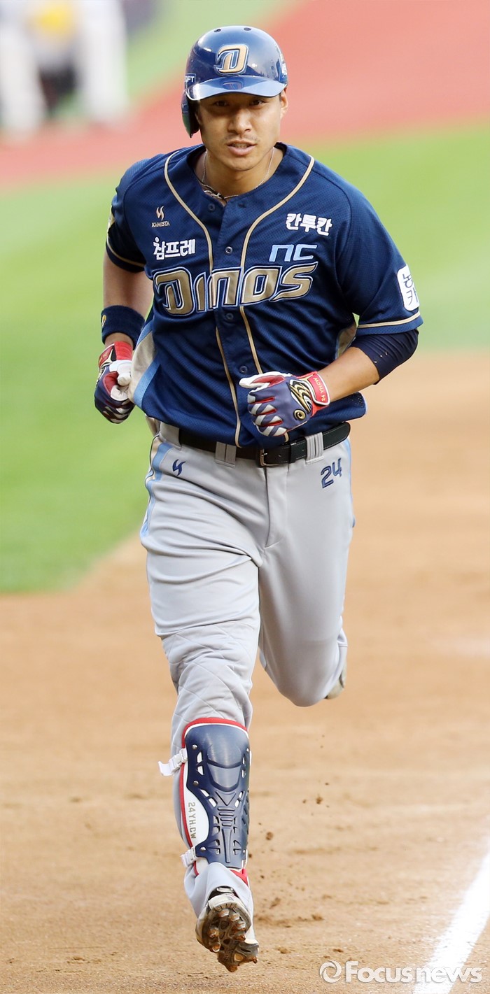 (서울=포커스뉴스) 28일 서울 잠실구장에서 열린 2016 프로야구 NC-두산 경기 2회초 NC 선두타자 조영훈이 두산 투수 니퍼트의 초구를 떄려 우월 솔로 홈런을 치고 홈인하고 있다.