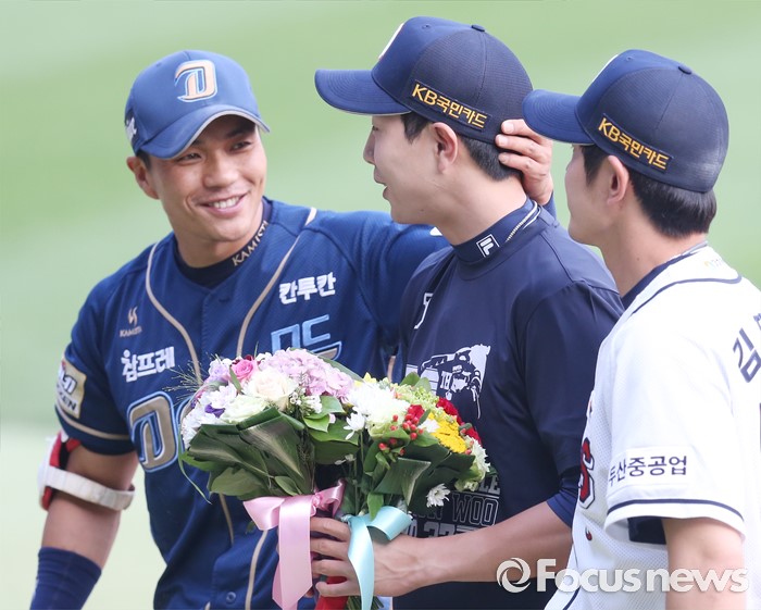 (서울=포커스뉴스) 28일 서울 잠실구장에서 열린 2016 프로야구 NC-두산 경기에 앞서 두산 박건우의 사이클링 안타 기록 시상식을 갖고 NC 주장 이종욱이 꽃다발을 전달하면서 머리를 쓰다듬어 주고 있다. 오른쪽은 두산 주장 김재호.