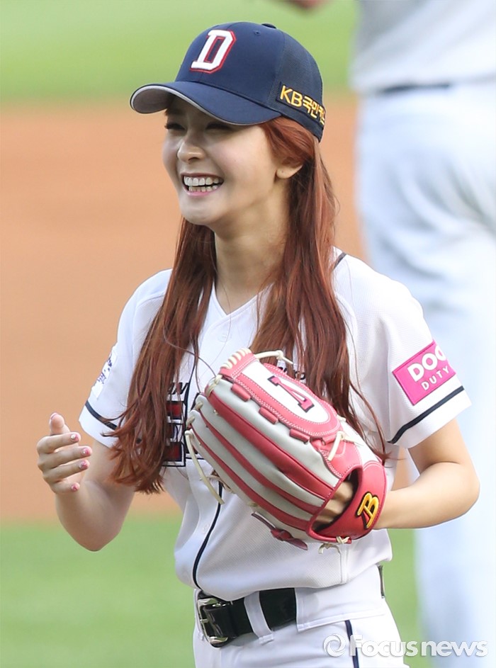 (서울=포커스뉴스) 28일 서울 잠실구장에서 열린 2016 프로야구 NC-두산 경기에서 걸그룹 소나무의 나현이 시구를 마치고 포수에게 걸어가고 있다.