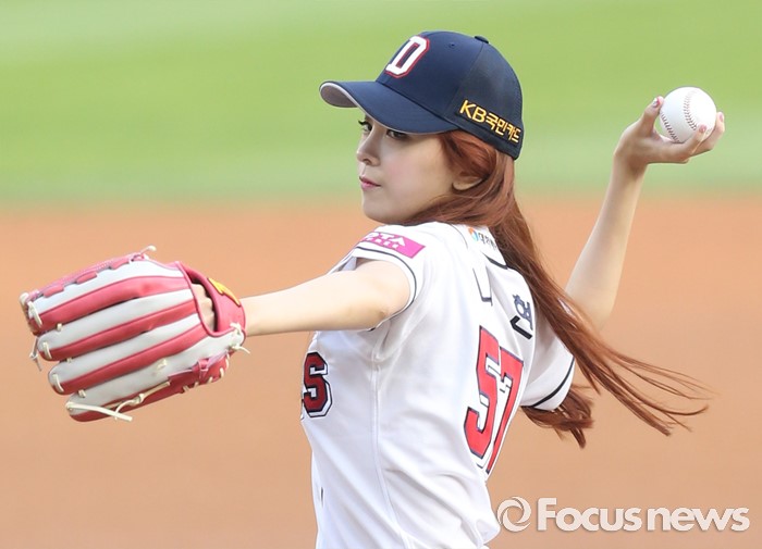 (서울=포커스뉴스) 28일 서울 잠실구장에서 열린 2016 프로야구 NC-두산 경기에서 걸그룹 소나무의 나현이 투수 마운드를 밟고 시구하고 있다.
