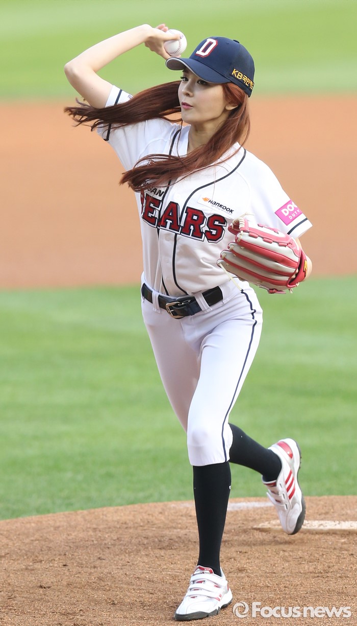 (서울=포커스뉴스) 28일 서울 잠실구장에서 열린 2016 프로야구 NC-두산 경기에서 걸그룹 소나무의 나현이 투수 마운드를 밟고 시구하고 있다.