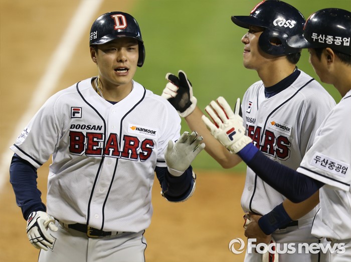 (서울=포커스뉴스) 28일 서울 잠실구장에서 열린 2016 프로야구 NC-두산 경기 7회말 2사 1,2루에서 두산 민병헌이 좌월 3점 홈런을 치고 선행주자의 환영을 받으며 홈인하고 있다.