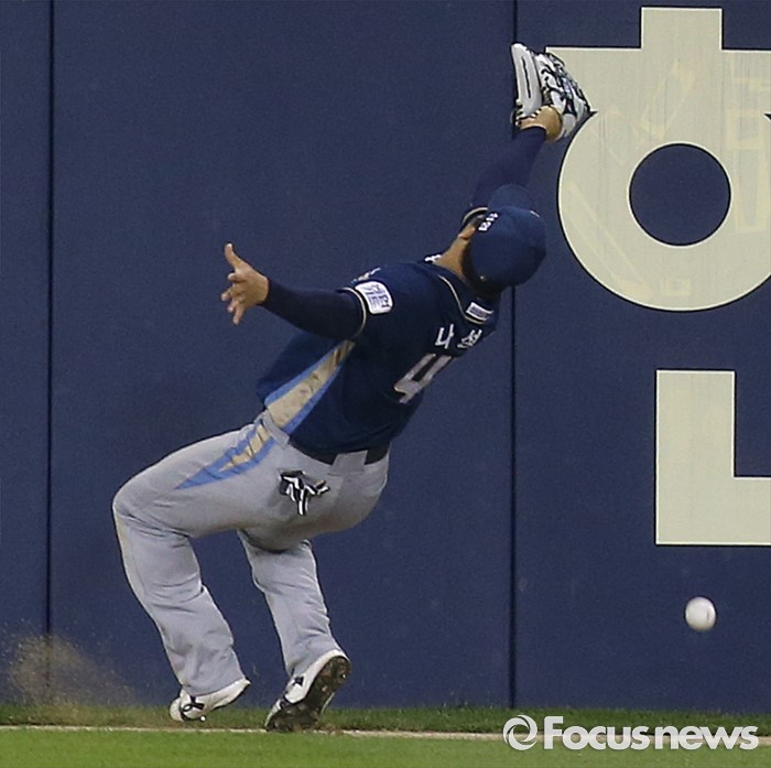 (서울=포커스뉴스) 28일 서울 잠실구장에서 열린 2016 프로야구 NC-두산 경기 7회말 2사 만루에서 NC 우익수 나성범이 두산 에반스의 타구를 놓치고 있다.