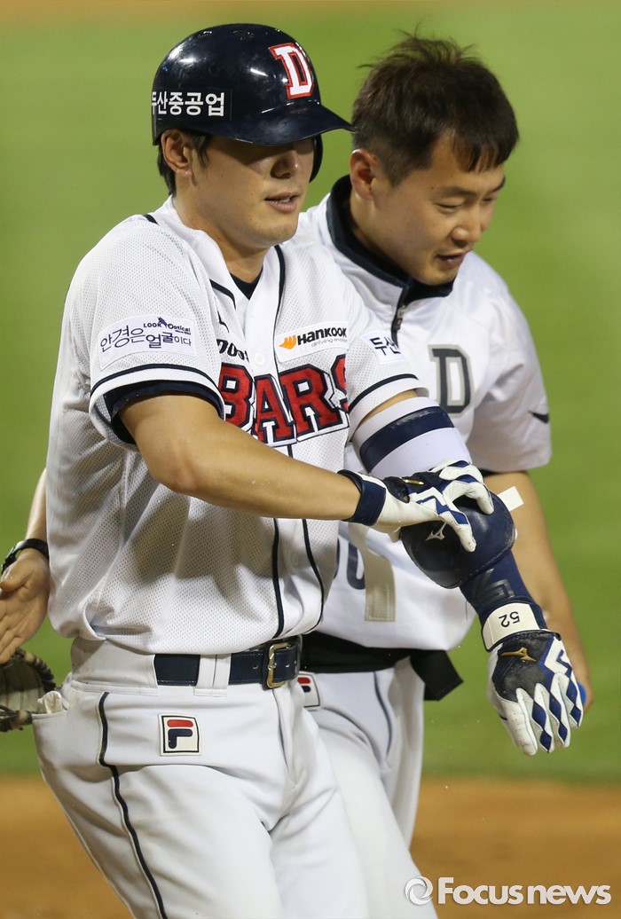 (서울=포커스뉴스) 28일 서울 잠실구장에서 열린 2016 프로야구 NC-두산 경기 5회말 NC 투수 이민호의 투구에 왼쪽 팔을 맞은 두산 김재호가 1루로 걸어 나가고 있다.