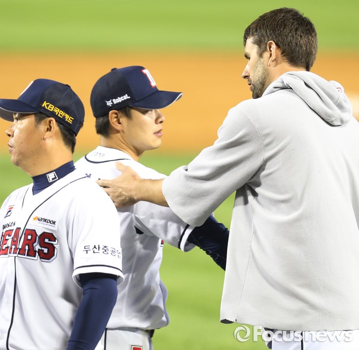 (서울=포커스뉴스) 28일 서울 잠실구장에서 열린 2016 프로야구 NC-두산 경기에서 NC를 물리치고 50승을 한 두산 민병헌과 선발투수 니퍼트가 악수하고 있다.