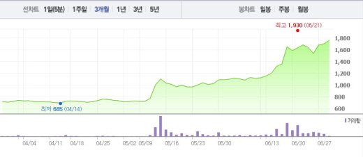 사실 키스톤글로벌은 10일부터 17일까지 6거래일 연속 상승세를 나타내는 등 상승곡선을 그려왔다. 1달 전 주가인 5월30일(1090원)과 비교했을 때 무려 62.8% 상승한 수치다.