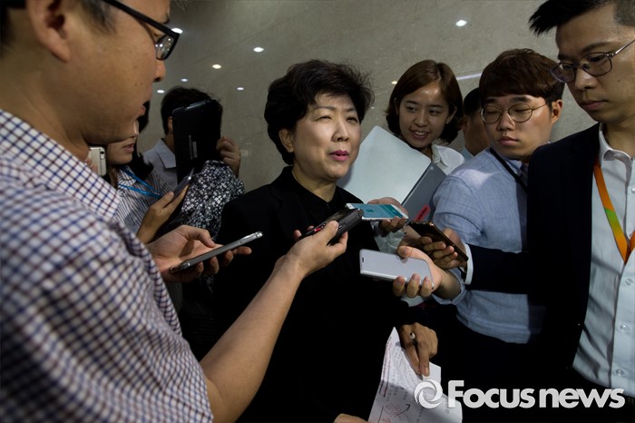(서울=포커스뉴스) 박인숙 새누리당 의원이 29일 오전 서울 여의도 국회에서 5촌 조카를 5급 비서관에, 동서를 비서에 채용한 사실을 밝히며 국민들에게 사과 입장을 밝히는 기자회견을 마친 뒤 취재진 질문에 답하고 있다.