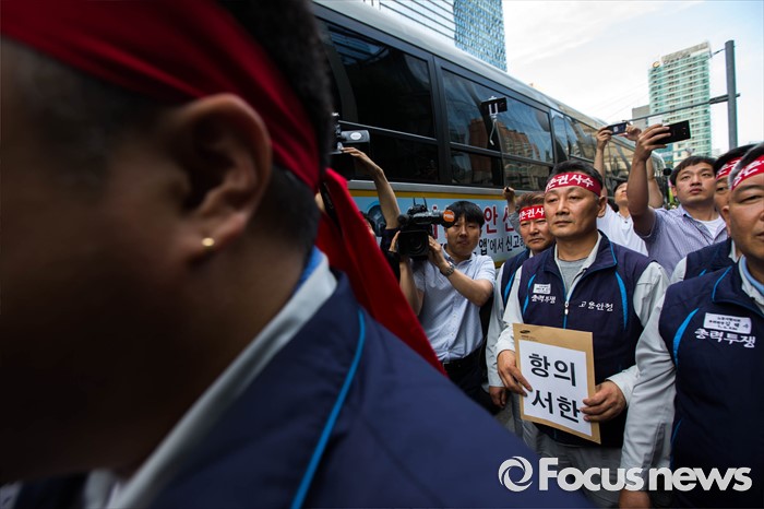 (서울=포커스뉴스) 29일 오전 서울 서초구 삼성 사옥 앞에서 삼성중공업 노동협의회 관계자들이 구조조정에 반대하는 항의서한을 삼성 측에 전달하기 위해 삼성의 보안요원들과 대치하고 있다. 삼성중공업은 지난 15일 임원들의 임금 반납, 희망퇴직 등이 포함된 구조조정안을 공개했으며 올해 약 1500명 규모의 희망퇴직을 단행할 계획이라 밝혔다.