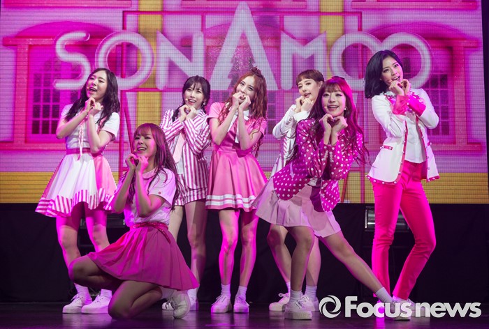 (서울=포커스뉴스) 29일 오전 서울 마포구 예스24 무브홀에서 열린 걸그룹 소나무의 미니앨범 '넘나 좋은 것' 쇼케이스에 참여한 멤버들이 신곡 '넘나 좋은 것'의 무대를 선보이고 있다.