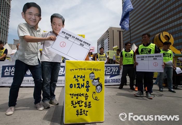 (서울=포커스뉴스) 29일 오전 서울 광화문광장에서 전국금속노동조합 삼성전자서비스지회와 반올림, 참여연대 등 시민단체들이 '삼성 이재용 3대 세습, 이대로 괜찮은가?' 찬반투표 선포 기자회견을 하고 있다.