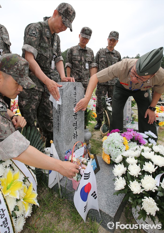(대전=포커스뉴스) 제2연평해전 14주기를 맞은 29일 오전 대전 유성구 국립대전현충원 제2연평해전 전사자 묘역에서 故 윤영하 소령의 해군사관학교 50기 동기생들이 추모하며 묘비를 닦고 있다.