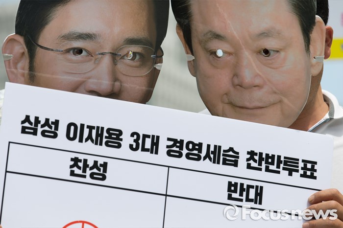 (서울=포커스뉴스) 29일 오전 서울 광화문광장에서 전국금속노동조합 삼성전자서비스지회와 반올림, 참여연대 등 시민단체들이 '삼성 이재용 3대 세습, 이대로 괜찮은가?' 찬반투표 선포 기자회견 후 투표 참여 독려 퍼포먼스를 펼치고 있다.