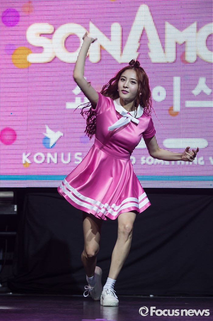 (서울=포커스뉴스) 29일 오전 서울 마포구 예스24 무브홀에서 열린 걸그룹 소나무의 미니앨범 '넘나 좋은 것' 쇼케이스에 참여한 멤버 나현이 포토타임을 갖고 있다.
