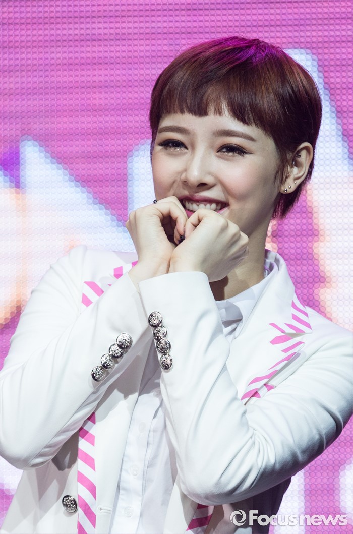 (서울=포커스뉴스) 29일 오전 서울 마포구 예스24 무브홀에서 열린 걸그룹 소나무의 미니앨범 '넘나 좋은 것' 쇼케이스에 참여한 멤버 뉴썬이 포토타임을 갖고 있다.