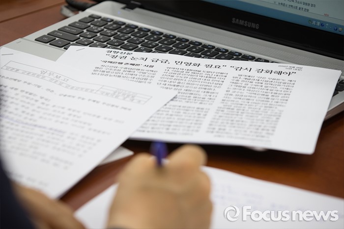 (서울=포커스뉴스) 29일 오전 서울 여의도 국회에서 열린 정무위 전체회의에 참석한 한 의원의 자리 앞에 '국책은행 존폐론' 관련 기사가 놓여져 있다.