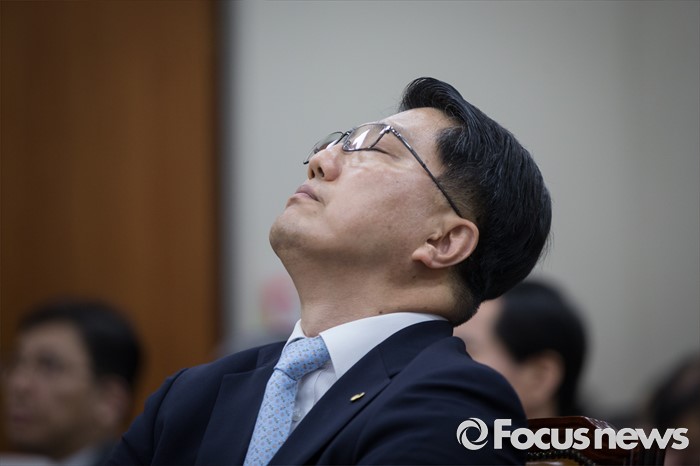 (서울=포커스뉴스) 진웅섭 금융감독원장이 29일 오전 서울 여의도 국회 정무위 전체회의에 출석해 의원들 질문 끝에 고개를 젖히고 있다.