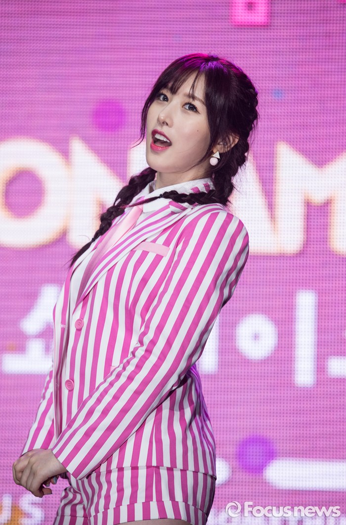 (서울=포커스뉴스) 29일 오전 서울 마포구 예스24 무브홀에서 열린 걸그룹 소나무의 미니앨범 '넘나 좋은 것' 쇼케이스에 참여한 멤버 의진이 포토타임을 갖고 있다.