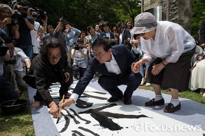 (서울=포커스뉴스) 29일 오전 서울 중구 예장동 옛 통감관저 터에서 열린 일본군 위안부 피해자 추모공원 '기억의 터' 기공식에 김복동(오른쪽) 할머니와 박원순 서울시장이 강병인 작가의 붓글씨 퍼포먼스에 참가하고 있다.