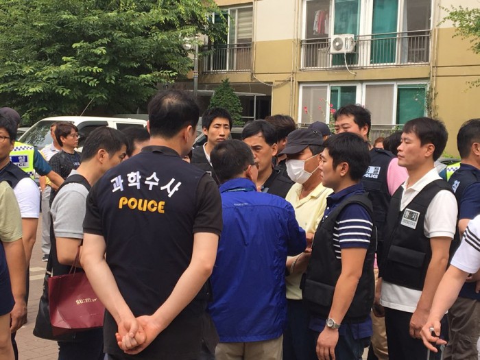 (서울=포커스뉴스) 술에 취해 같은 아파트 단지에 사는 이웃 주민을 살해한 사건에 대한 현장검증에서 유가족들과 주민들이 피의자를 향해 분노를 표출했다.
