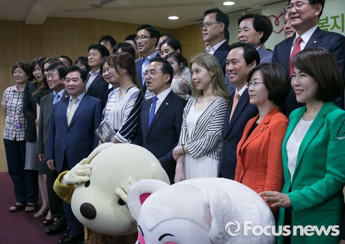 (서울=포커스뉴스) 29일 오후 서울 여의도 국회 의원회관에서 열린 동물복지포럼 출범식에 참석한 우상호 더불어민주당 원내대표, 이정미 정의당 원내수석부대표, 가수 배다해, 다나 등 의원 및 참석자들이 기념촬영을 하고 있다.