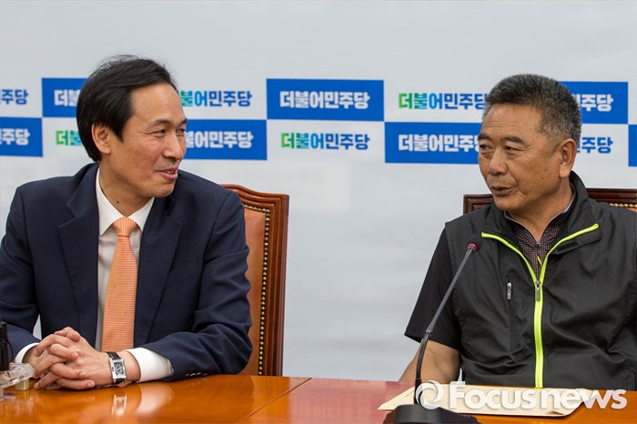 (서울=포커스뉴스) 우상호 더불어민주당 원내대표가 29일 오후 서울 여의도 국회에서 열린 '서해 5도 중국어선 불법조업 대책 마련 및 해양주권 수호 위안 협약식'에 참석한 박태원 연평도 어촌계장과 대화 하고 있다.