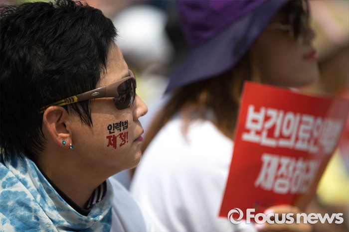 (서울=포커스뉴스) 29일 오후 서울 용산구 서울역 앞에서 보건의료노조의 총력투쟁 결의대회 집회가 열리고 있다.