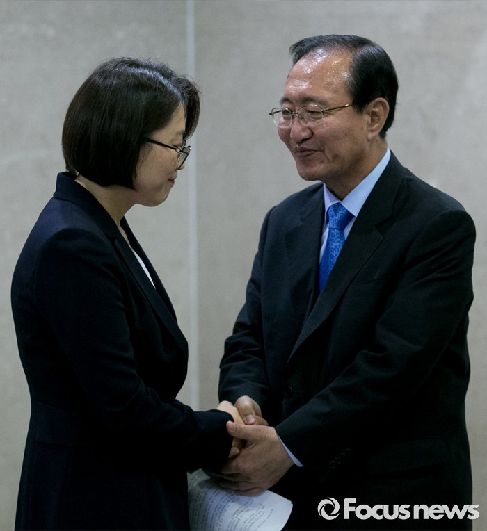 (서울=포커스뉴스) 29일 오후 서울 여의도 국회 정론관에서 미래창조과학방송통신위원회 재배정을 요구하며 농성에 들어갔던 추혜선(왼쪽) 정의당 의원과 노회찬 원내대표가 농성을 해제하고 외교통일위원회 배정을 받아들이는 내용의 기자회견을 마친 뒤 악수하고 있다.