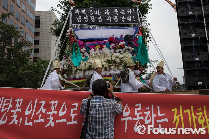 (서울=포커스뉴스) 29일 오후 서울 영등포구 국회의사당 인근에서 전국화훼협회 등 27개 단체원들이 김영란법 반대를 외치며 꽃상여를 메고 행진하고 있다.