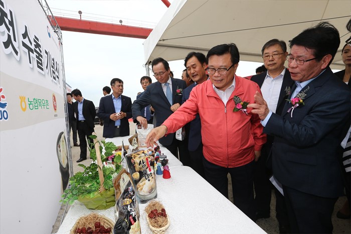 (군산=포커스뉴스) 이동필 농림축산식품부 장관이 29일 전북 군산항 컨테이너터미널에서 열린 대 중국 삼계탕 첫 수출 기념식 행사장에서 송하진 전라북도지사 등이 참석한 가운데 수출삼계탕을둘러보고 있다.
