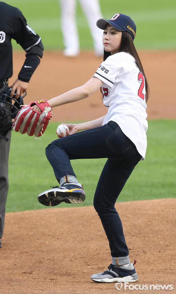 (서울=포커스뉴스) 29일 서울 잠실구장에서 열린 2016 프로야구 NC-두산 경기에서 걸그룹 '러블리즈'의 서지수가 시구하고 있다.