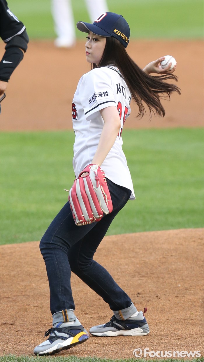 (서울=포커스뉴스) 29일 서울 잠실구장에서 열린 2016 프로야구 NC-두산 경기에서 걸그룹 '러블리즈'의 서지수가 시구하고 있다.