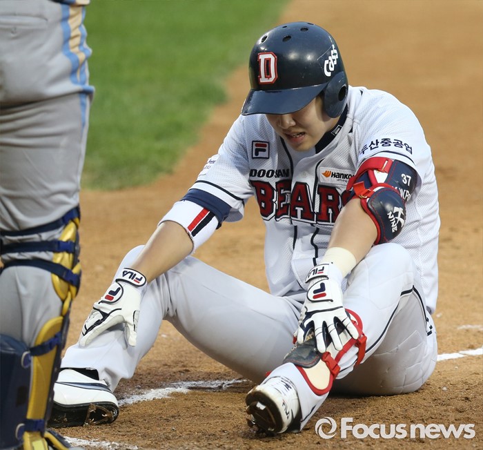(서울=포커스뉴스) 29일 서울 잠실구장에서 열린 2016 프로야구 NC-두산 경기 3회말 두산 박건우가 타격 도중 몸쪽 볼을 피하다 넘어져 주저 앉아 있다.