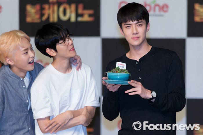 (서울=포커스뉴스) 29일 오후 서울 강남구 일지아트홀에서 열린 '굽네 볼케이노와 함께하는 엑소(EXO) 치밥 쿠킹 팬사인회'에서 엑소 세훈(오른쪽)이 포즈를 취하고 있다.