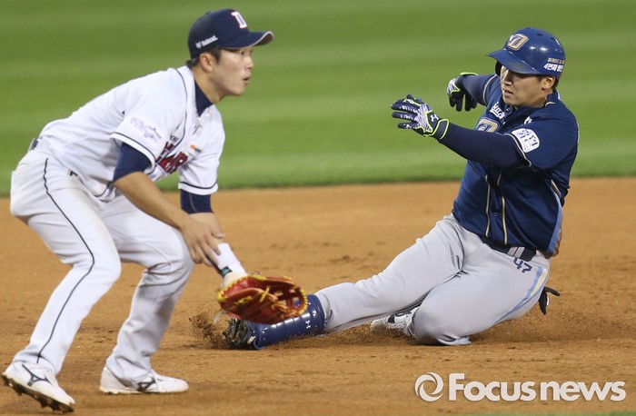 (서울=포커스뉴스) 29일 서울 잠실구장에서 열린 2016 프로야구 NC-두산 경기 4회초 1사 2,3루에서 NC 나성범이 우익수 오른쪽에 떨어지는 타구를 날리고 3루에서 세이프되고 있다.