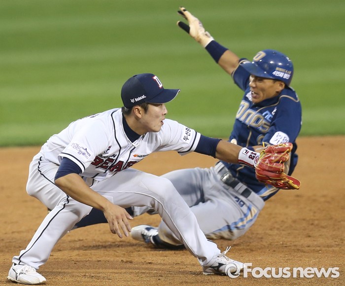 (서울=포커스뉴스) 29일 서울 잠실구장에서 열린 2016 프로야구 NC-두산 경기 4회초 1사 1루에서 NC 박민우의 우전 안타때 1루주자 이종욱이 3루에서 슬라이딩하며 세이프되고 있다.