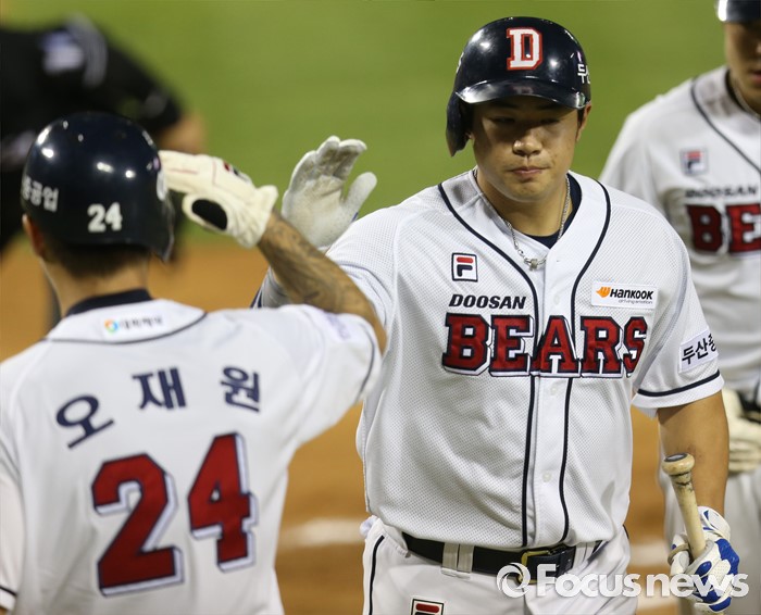 (서울=포커스뉴스) 29일 서울 잠실구장에서 열린 2016 프로야구 NC-두산 경기 6회말 두산 김재환이 3점 홈런을 치고 홈인하고 있다. 선행주자 오재원이 거수경례하며 김재환을 맞고 있다.