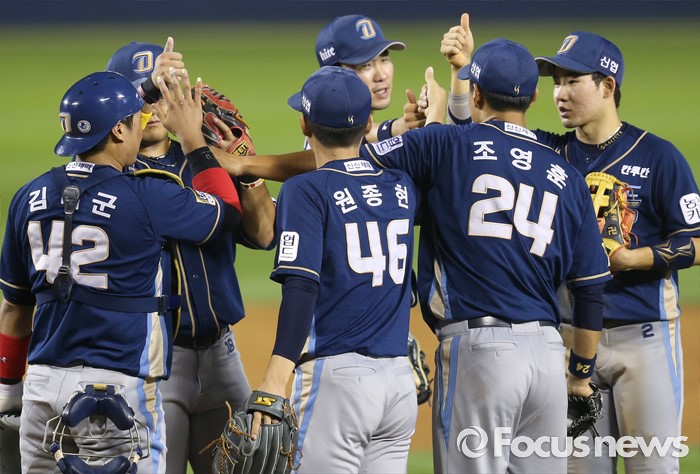 (서울=포커스뉴스) 29일 서울 잠실구장에서 열린 2016 프로야구 NC-두산 경기에서 두산을 물리치고 4연패의 늪에서 벗어난 NC 선수들이 마운드에 모여 하이파이브하며 승리의 기쁨을 나누고 있다.
