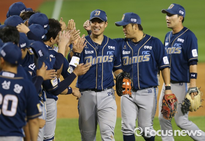 (서울=포커스뉴스) 29일 서울 잠실구장에서 열린 2016 프로야구 NC-두산 경기에서 두산을 물리치고 4연패의 늪에서 벗어난 NC 선수들이 하이파이브하며 승리의 기쁨을 나누고 있다.