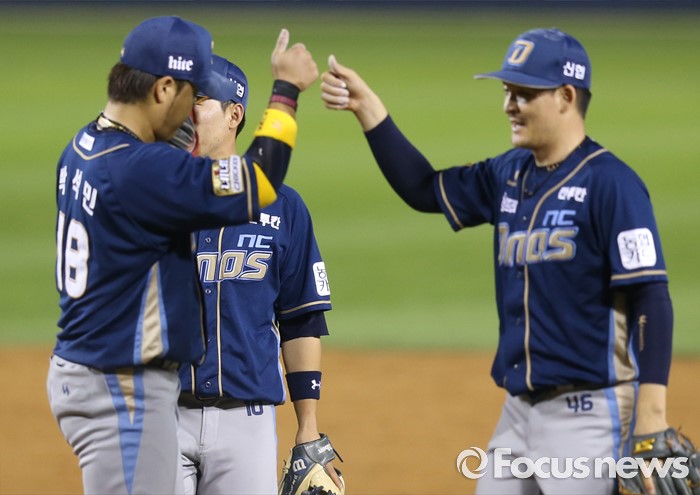 (서울=포커스뉴스) 29일 서울 잠실구장에서 열린 2016 프로야구 NC-두산 경기에서 두산을 물리치고 4연패의 늪에서 벗어난 NC 박석민과 원종현이 엄지를 부딪히며 승리의 기쁨을 나누고 있다.