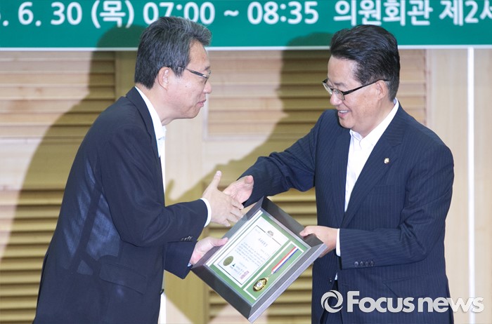 (서울=포커스뉴스) 30일 오전 서울 여의도 국회 의원회관에서 열린 국민의당 22차 집중역량강화 워크숍에 참석한 박지원(오른쪽) 비대위원장이 김성식 정책위의장에게 우수의원상 시상을 하고 있다.