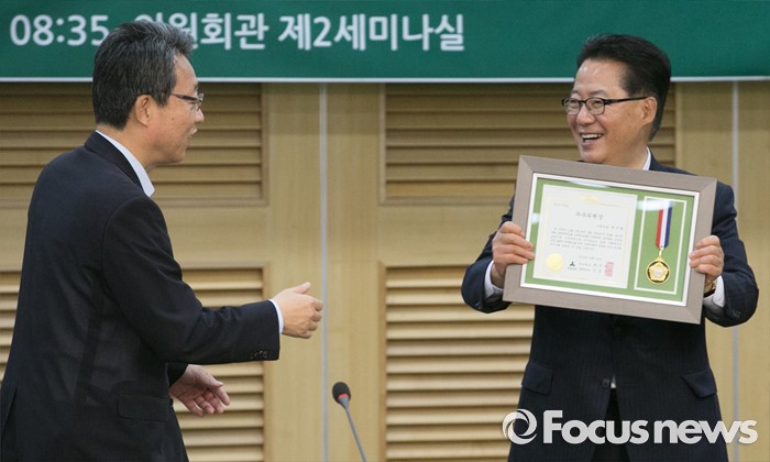 (서울=포커스뉴스) 30일 오전 서울 여의도 국회 의원회관에서 열린 국민의당 22차 집중역량강화 워크숍에 참석한 박지원(오른쪽) 비대위원장이 자신의 우수의원상 상패를 들고 있다.
